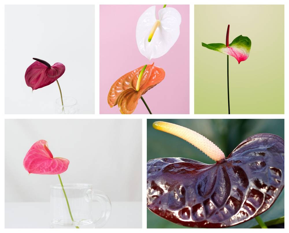 Die Anthurie ist an ihrem auffallenden und ungewöhnlichen Aussehen zu erkennen. Aus ihrem in verschiedenen leuchtenden Farben erhältlichen Hochblatt ragt der Blütenkolben empor. In der Form des Hochblattes kann man ein Herz erkennen. Das glänzend farbige Hochblatt kann je nach Sorte weiß, rot, rosa, violett, orange, grün oder mehrfarbig sein.