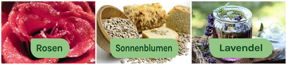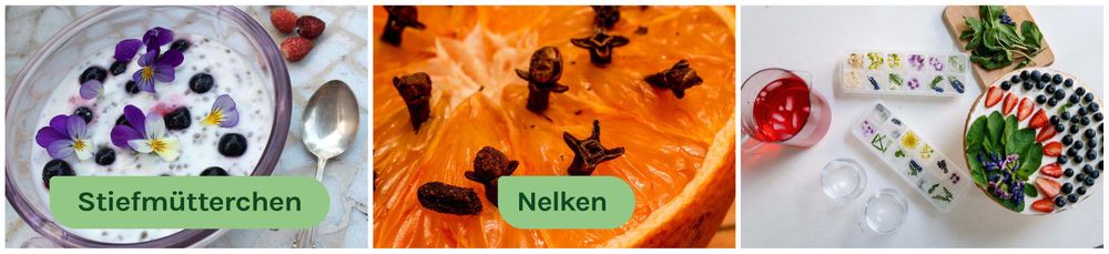 Zu den bekanntesten essbaren Blumen und Blüten zählen Rosen, Sonnenblumen, Nelken, Echinacin, Chrysanthemen, Gänseblümchen, Zucchiniblüten und andere Kürbisblüten, Veilchen, Stiefmütterchen, Ringelblumen, Hibiskus, Lavendel und natürlich Kräuter.