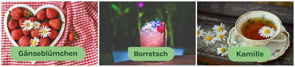Die Blütenköpfe des allzeit beliebten Gänseblümchens, Löwenzahn, Kapuzinerkresse, und Borretsch sind weitere hervorragende Blumen um Gerichte schmackhaft zu machen und ansprechend zu dekorieren. Einen entspannenden Kamillentee vor dem Schlafengehen trinken ist großartig, aber versuchen Sie Kamillenblüten über frische Salate zu streuen – einfach herrrlich!
