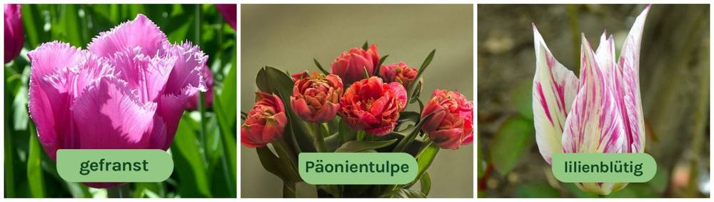 Seit der Entdeckung der Tulpe bis heute sind mehr als 5.000 Tulpensorten bekannt. Die Blüten sind in den Farben von weiß, gelb, orange, rot, rosa, lila und sogar schwarz sowie mehrfarbig erhältlich. Nur in der Farbe blau gibt es keine Tulpen. Die Blütenknospen der Tulpen sind symmetrisch, allerdings die Blütenblätter können gewellt oder gefranst sein. Die französischen Tulpen sind für ihren besonders langen Stiehl und den sehr großen Blütekopf bekannt. Päonientulpen sehen Pfingstrosen sehr ähnlich und Lilientulpen ähneln mit ihren spitzen Blütenblättern einer Lilie. In Farben und Formen sind Ihnen bei Tulpen fast keine Grenzen gesetzt.